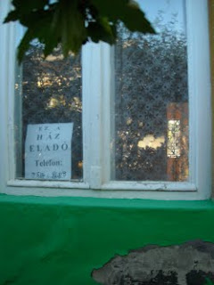 Nézem az üvegből, ahogy a temető fölött felhők úsznak el. Méregetem a fényviszonyokat, kora őszi fáradt napnyugta, szürke házfal, itt-ott a téglákig feltárulkozó romlás, olajzöld ablakkeret, pókháló, és egy elmosódott szövegű táblácska. HÁZ ELADÓ. A vaku elsül, mehetünk tovább.